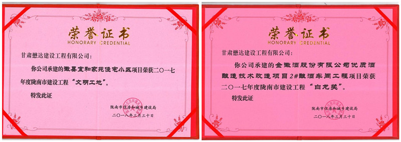 3月30日召開的隴南市2018年建設(shè)工程安全質(zhì)量監(jiān)管工作會(huì)議上,公司承建的金徽酒股份有限公司優(yōu)質(zhì)酒釀造技術(shù)改造項(xiàng)目2#釀酒車間工程項(xiàng)目榮獲2017年度隴南市建設(shè)工程“白龍獎(jiǎng)”,同時(shí)徽縣宜和家苑住宅小區(qū)項(xiàng)目榮獲2017年度隴南市建設(shè)工程“文明工地”。