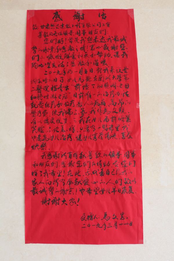 馬文忠女兒馬艷于2019年1月5日入院被確診為前提T細(xì)胞淋巴母細(xì)胞性淋巴瘤,目前仍在醫(yī)院治療之中,僅靠家人的工資無法解決巨額的治療費(fèi)用。在得知馬艷的病情后,3月9日,公司工會迅速向全體員工發(fā)出獻(xiàn)愛心的倡議,得到積極響應(yīng),僅4天時間就募得善款43270元。