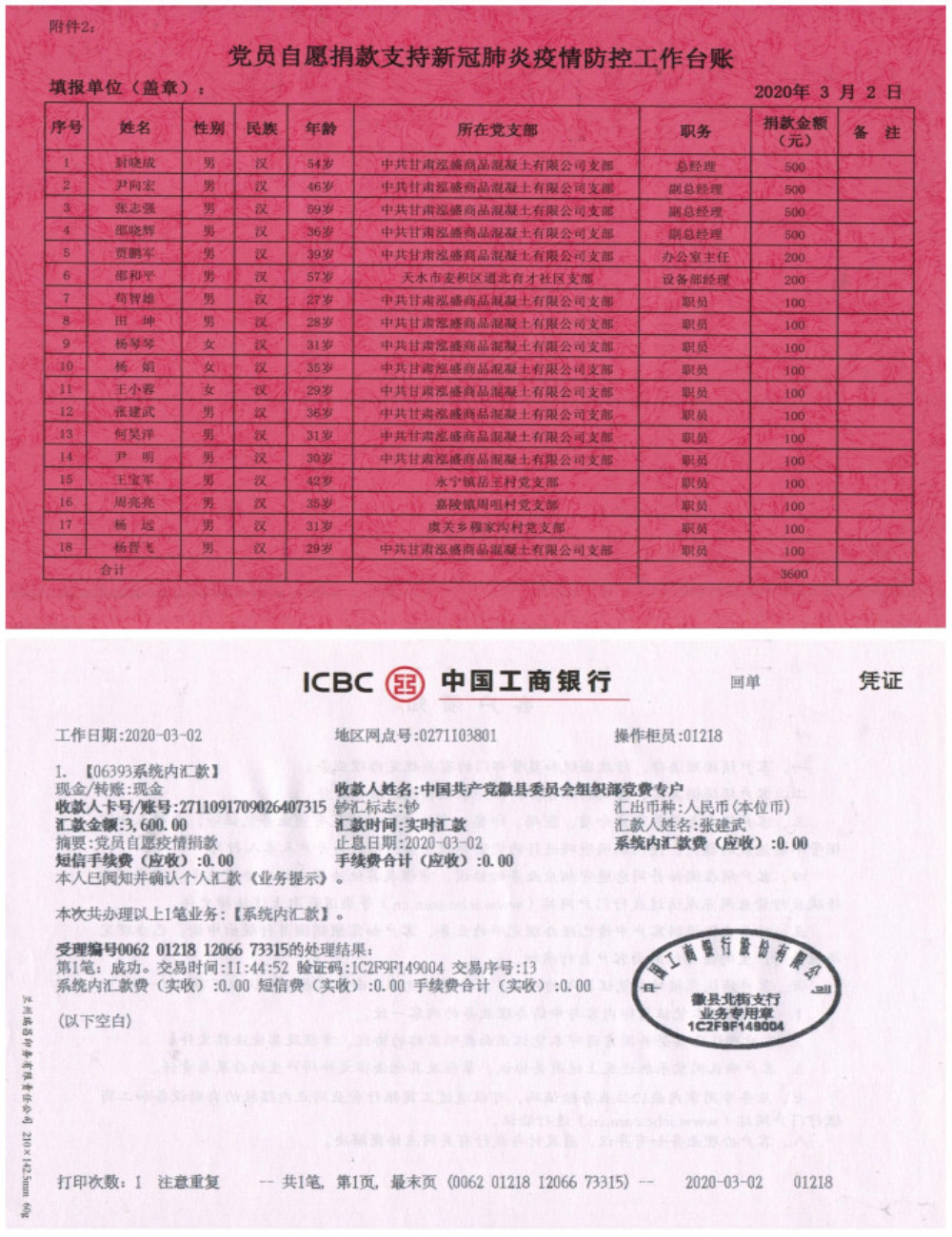 為積極響應黨中央對廣大黨員的號召,表達對新冠肺炎疫情防控工作的支持,3月2日,甘肅泓盛商品混凝土有限公司黨支部組織開展抗擊疫情自愿捐款活動。全體黨員支持疫情防控斗爭愿望強烈,紛紛踴躍捐款。支部18名黨員(含預備黨員)共計捐款3600元,已按組織程序上繳中國共產(chǎn)黨徽縣委員會組織部黨費專戶。