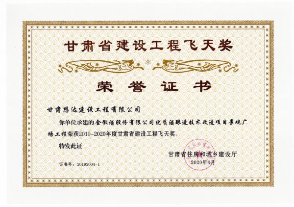 近日,甘肅省住房和城鄉(xiāng)建設(shè)廳關(guān)于2019-2020年度(第一批)甘肅省建設(shè)工程飛天金獎(jiǎng)和飛天獎(jiǎng)入選名單公示已經(jīng)結(jié)束,公司共有兩個(gè)項(xiàng)目榮獲甘肅省建設(shè)工程飛天獎(jiǎng)。其中,金徽財(cái)富中心項(xiàng)目榮獲飛天金獎(jiǎng),金徽酒股份有限公司優(yōu)質(zhì)酒釀造技術(shù)改造項(xiàng)目景觀廣場工程榮獲飛天獎(jiǎng)。據(jù)悉,“飛天金獎(jiǎng)”是甘肅省建設(shè)工程最高質(zhì)量獎(jiǎng)項(xiàng)。