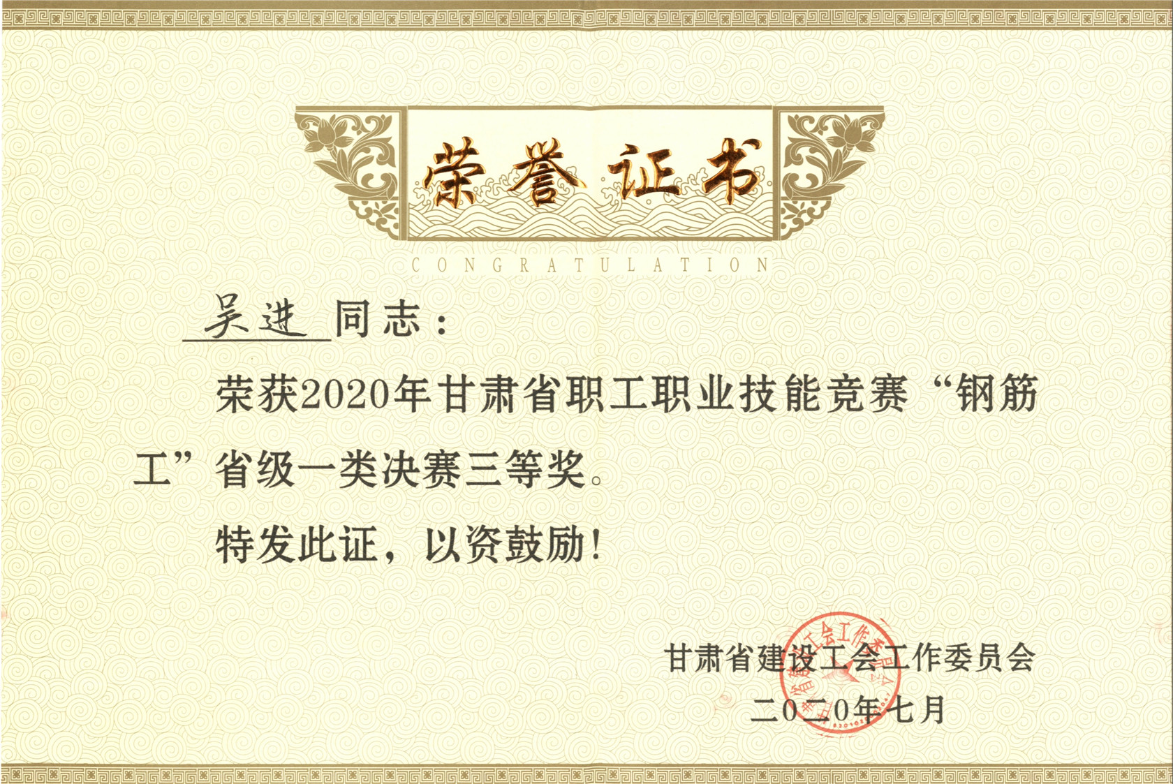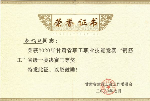 代表公司參加2020年甘肅省職工職業(yè)技能競賽“鋼筋工”大賽的吳進(jìn)、應(yīng)代江,榮獲省級一類決賽三等獎榮譽(yù)證書。