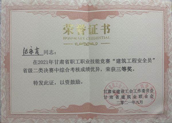 近日,2021年甘肅省職工職業(yè)技能競(jìng)賽“建筑工程安全員”省級(jí)二類決賽在蘭州新區(qū)成功教育園項(xiàng)目舉行。公司選派安全員張永吉、張宏明參加競(jìng)賽。