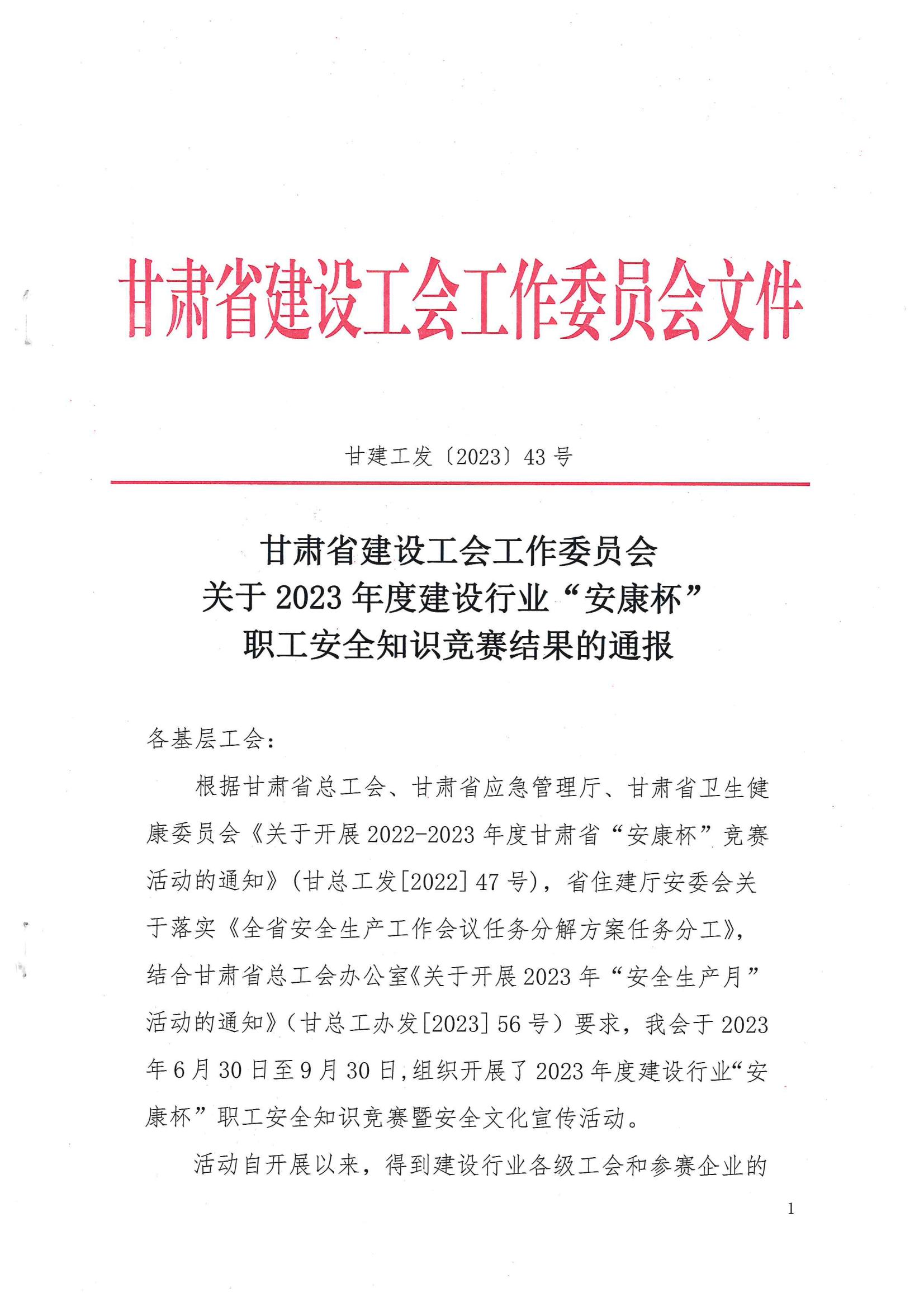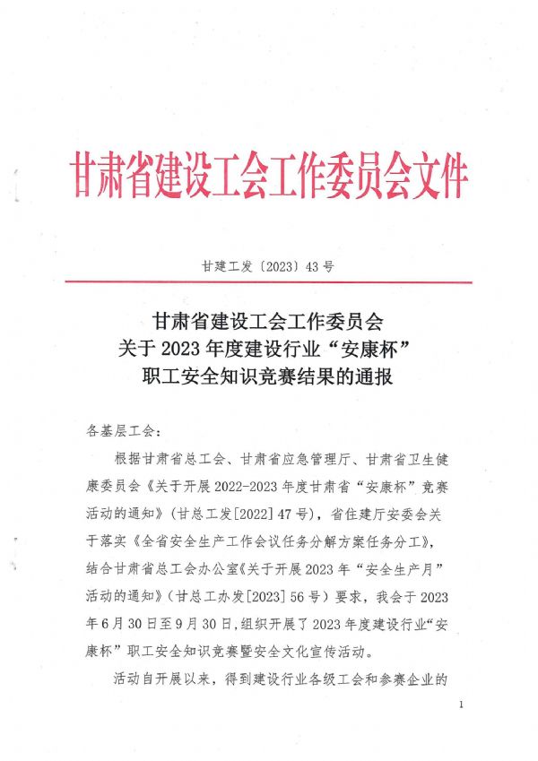 近日,甘肅省建設(shè)工會(huì)召開表彰大會(huì),對(duì)在2023年度建設(shè)行業(yè)“安康杯”職工安全知識(shí)競(jìng)賽暨安全文化宣傳活動(dòng)中成績(jī)突出的企業(yè)、班組及個(gè)人進(jìn)行表彰獎(jiǎng)勵(lì)。