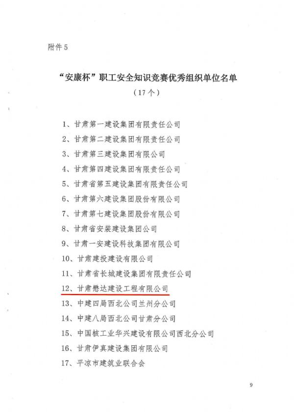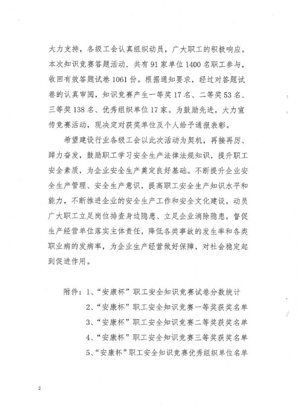 此次活動(dòng)以“排查整治安全隱患、共促安全健康發(fā)展”為主題,于今年6月30日至9月30日,在全省組織開展了2023年度建設(shè)行業(yè)“安康杯”職工安全知識(shí)競(jìng)賽暨安全文化宣傳活動(dòng)。公司共有兩名員工榮獲“安康杯”職工安全知識(shí)競(jìng)賽二等獎(jiǎng),八名員工榮獲三等獎(jiǎng),公司榮獲“安康杯”職工安全知識(shí)競(jìng)賽“優(yōu)秀組織獎(jiǎng)”。