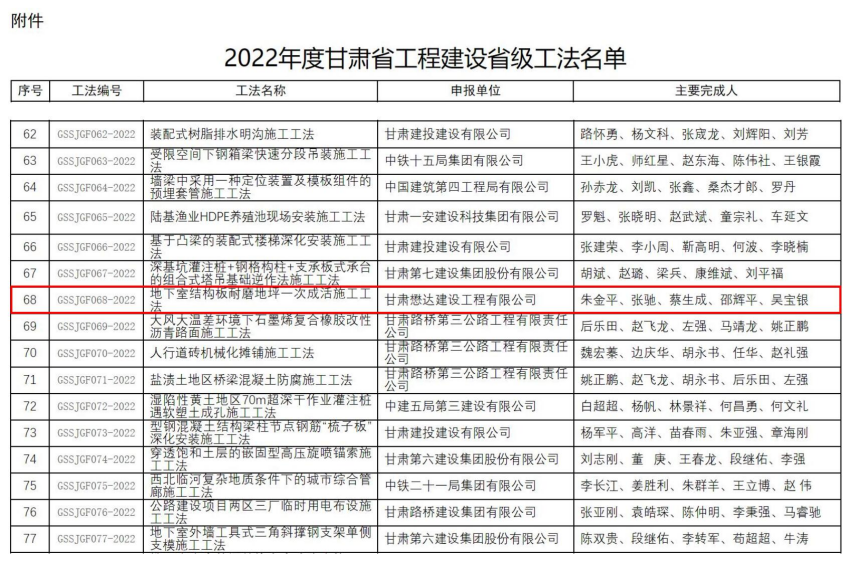 6月20日,甘肅省住房和城鄉(xiāng)建設(shè)廳下發(fā)文件《甘肅省住房和城鄉(xiāng)建設(shè)廳關(guān)于公布2022年度甘肅省工程建設(shè)省級(jí)工法的通知》(甘建質(zhì)〔2023〕127號(hào)),公司《地下室結(jié)構(gòu)板耐磨地坪一次成活施工工法》,根據(jù)《甘肅省工程建設(shè)工法管理辦法》(甘建工〔2016〕152號(hào)),省住建廳評(píng)審,經(jīng)公示無(wú)異議,獲評(píng)2022年度甘肅省省級(jí)工法。